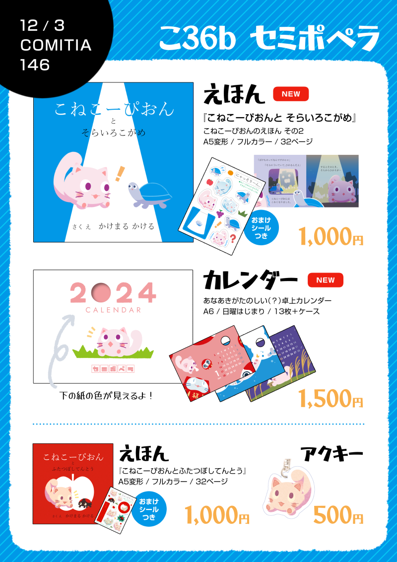 2023年12月3日(日)開催のCOMITIA146にて、こねこーぴおんの絵本やグッズを頒布します!