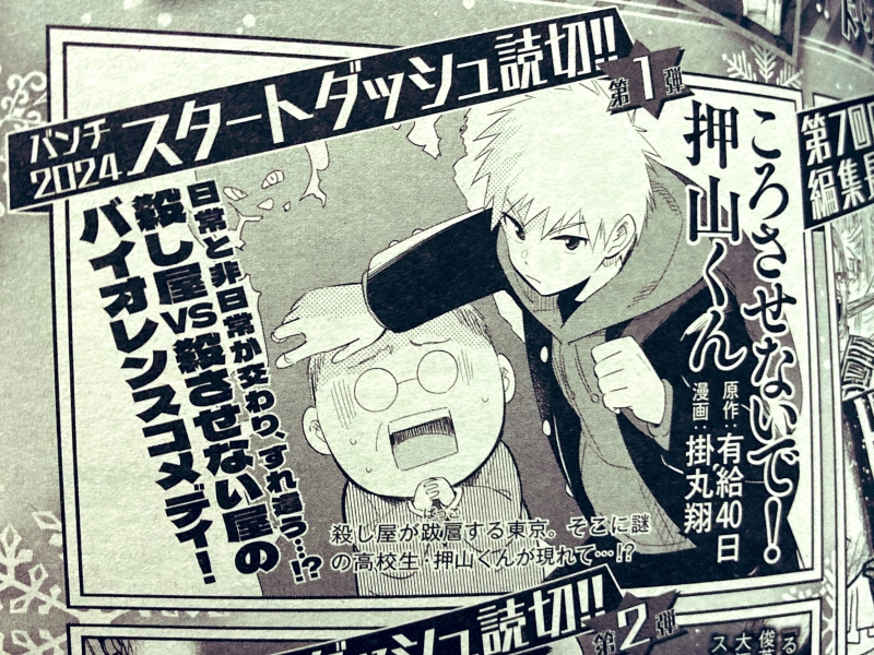 2024年01月19日(金)発売の月刊コミックバンチ2024年3月号に読切漫画『ころさせないで!押山くん』が掲載されます!原作は有給40日さんです。画像は発売中の2月号に掲載されている予告カットです!